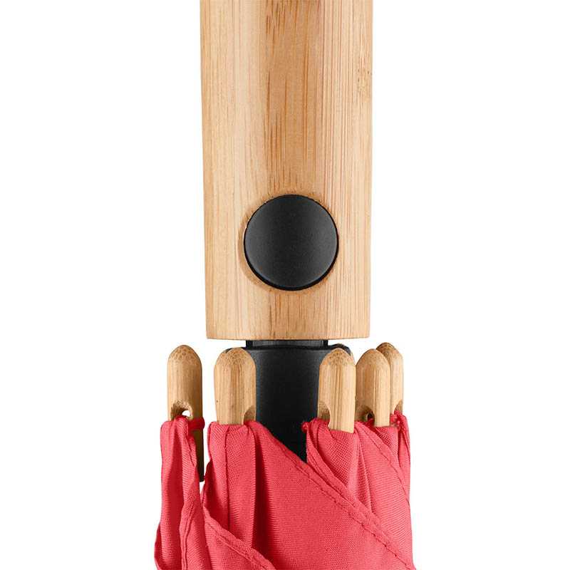 Convenient automatic function for quick opening, high-quality Windproof PLUS system for maximum frame flexibility in stormy conditions, flexible fibreglass ribs, lightweight bamboo shaft, polyester ponge cover material made of recycled plastics, with waterSAVE® label on the closing strap (with new deliveries), bamboo tips, straight bamboo handle with black push-button and promotional labelling option. Also available as mini umbrella (art. 5429).