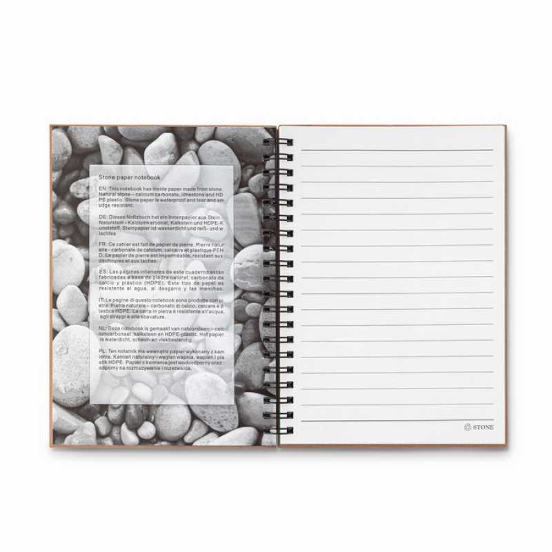 Zápisník s obalem z recyklovaného kartonu. Kroužková vazba. 140 linkovaných stran z minerálního papíru (70 listů). Minerální papír je vyroben z uhličitanu vápenatého a HDPE (polyethylenové pryskyřice), která se používá jako pojivo. Je voděodolný a odolný