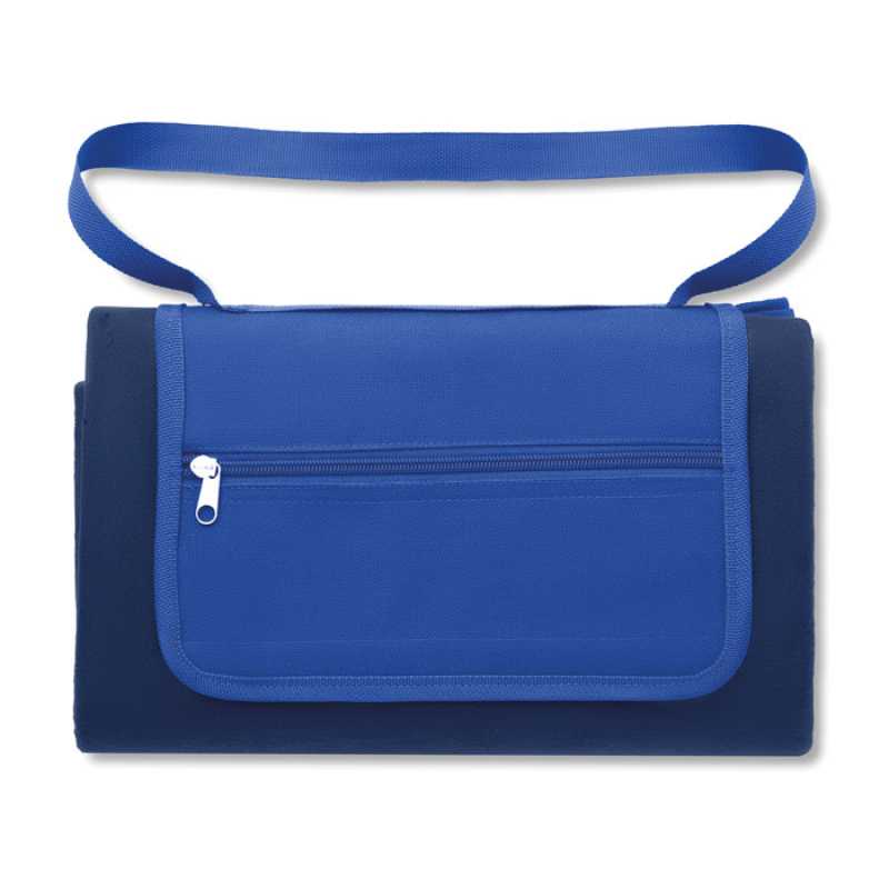 Skládací fleecová deka na suchý zip s poutkem a popruhem přes rameno, ze spodní strany voděodolný PE, 160 g/m2. 1500 x 1200 mm| Složená: o150 x 315 mm