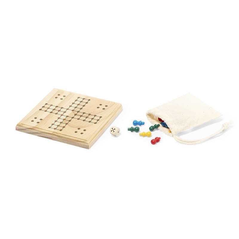NOVINKA 2025. Entertaining parcheesi game made of wood. Contains a board, 16 counters in 4 different colours and a dice. Suitable for 2 to 4 players. With handy cotton bag for storing the pieces. Presented individually in a kraft design box.