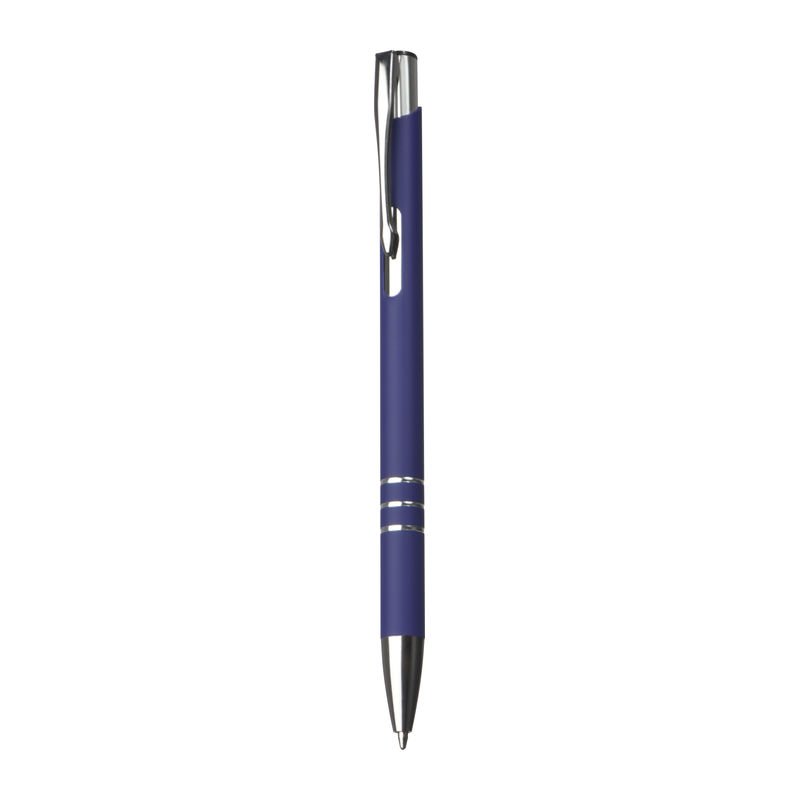 Hliníkové guľôčkové pero so saténovým pogumovaným povrchom príjemným na dotyk a modrou náplňou.