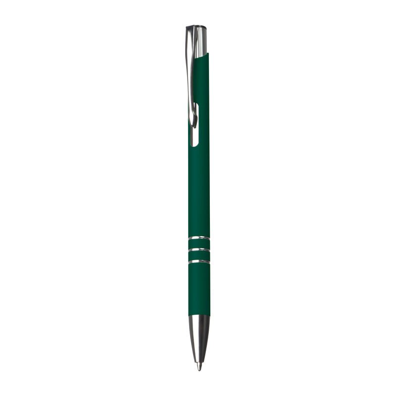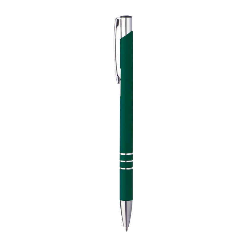 Hliníkové guľôčkové pero so saténovým pogumovaným povrchom príjemným na dotyk a modrou náplňou.