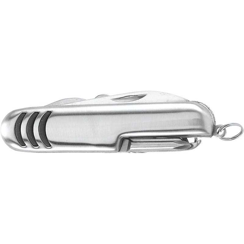 Stainless steel pocket knife with seven functions. Including: corkscrew, cross-head screwdriver, bottle opener, scissors, knife, file, and can opener.