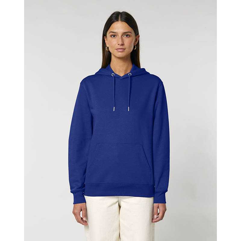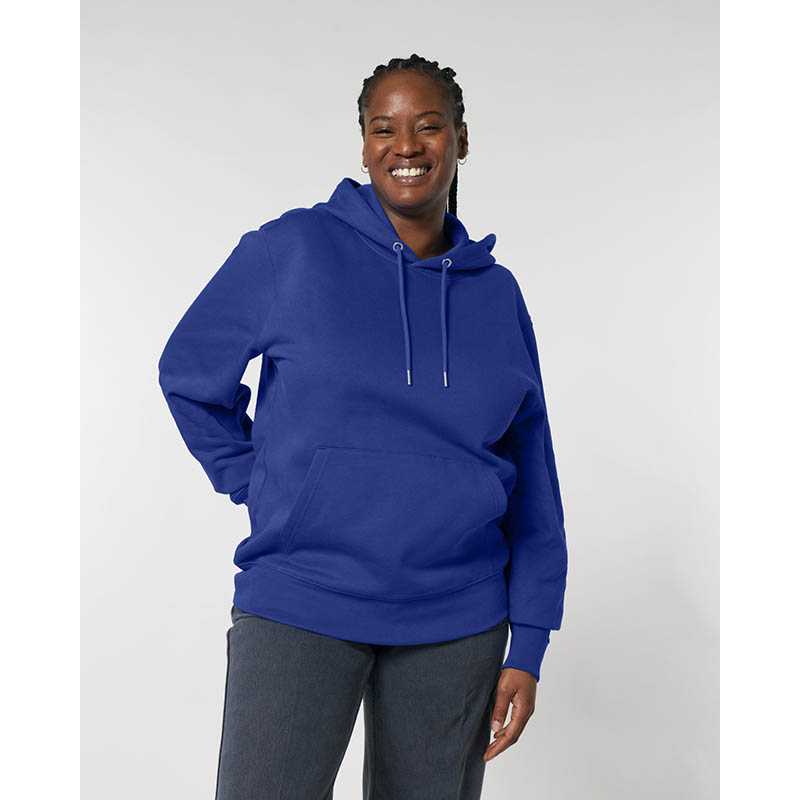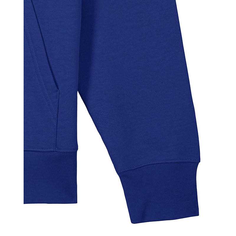 Kruhově dopřádaná bavlna. Designová dvouvrstvá kapuce. Velká klokaní kapsa. Kapsa na rukávu se zipem. Manžety ze sladěné tkaniny