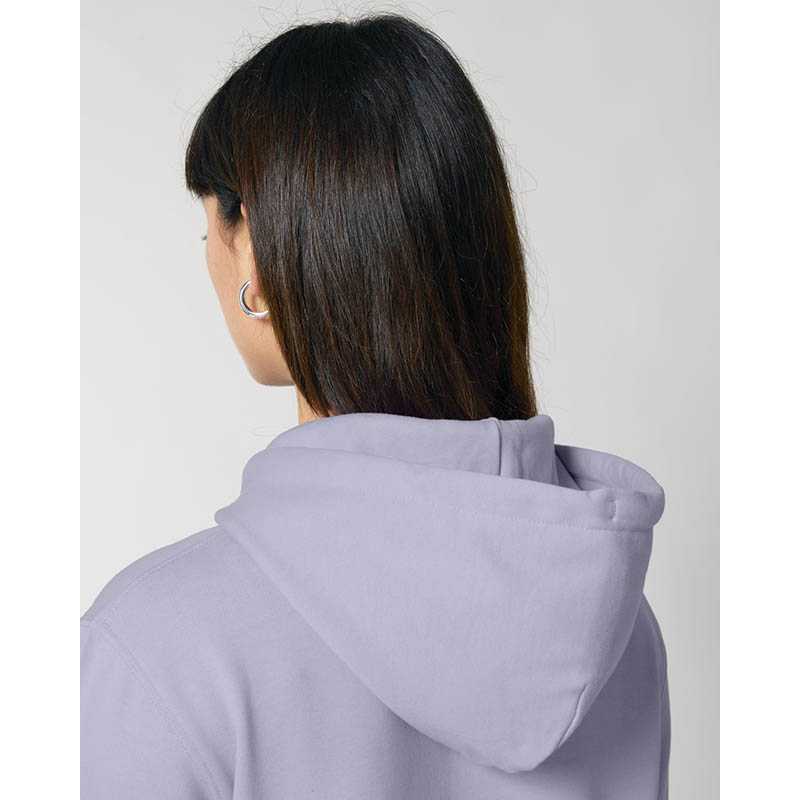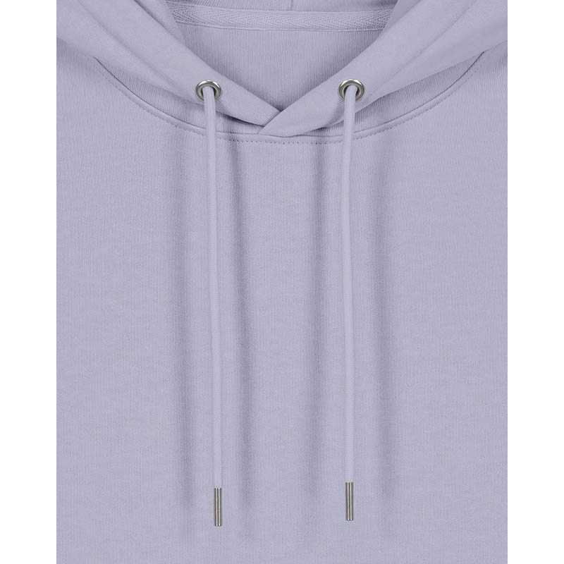 Made from in-house organic cutting waste Set-in sleeve Double layered hood in self fabric Round drawcords in matching body colour with metal tipping Metal eyelets Inside herringbone back neck tape Self fabric half moon at back neck Single needle topstitch