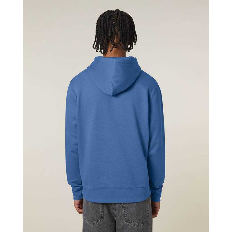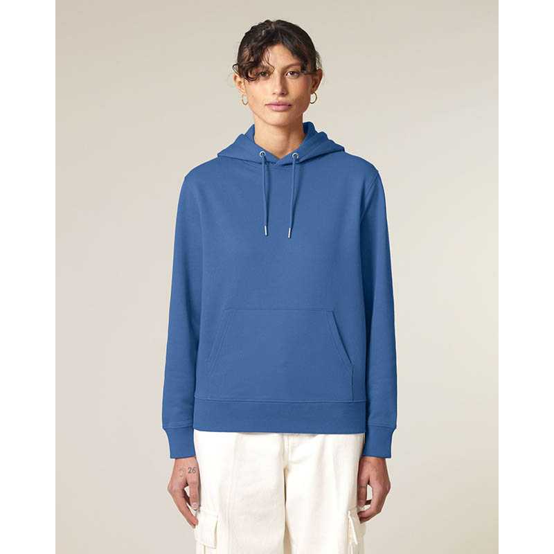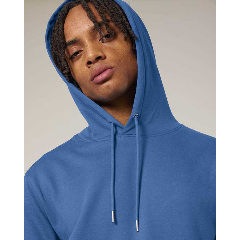 Kruhově dopřádaná bavlna. Designová dvouvrstvá kapuce. Velká klokaní kapsa. Kapsa na rukávu se zipem. Manžety ze sladěné tkaniny