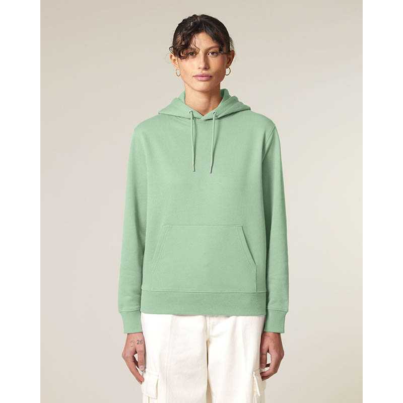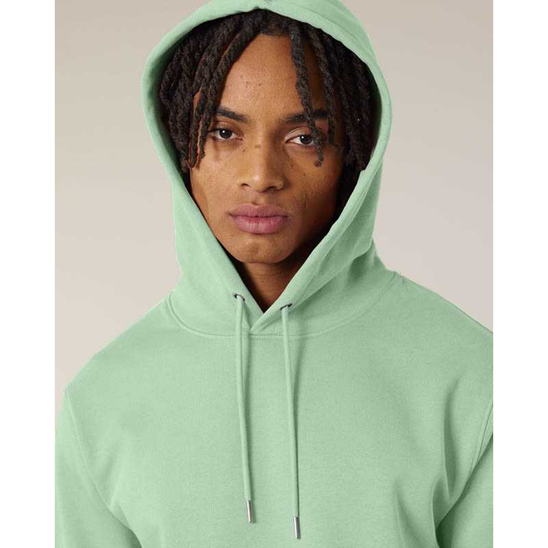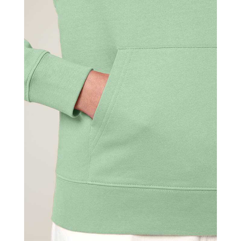 Kruhově dopřádaná bavlna. Designová dvouvrstvá kapuce. Velká klokaní kapsa. Kapsa na rukávu se zipem. Manžety ze sladěné tkaniny