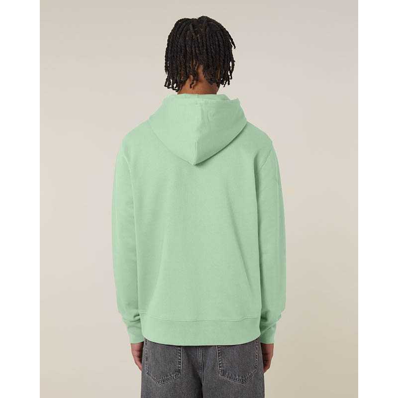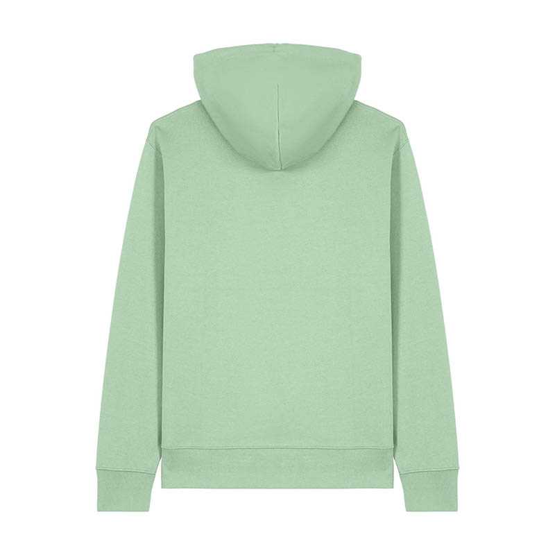 Made from in-house organic cutting waste Set-in sleeve Double layered hood in self fabric Round drawcords in matching body colour with metal tipping Metal eyelets Inside herringbone back neck tape Self fabric half moon at back neck Single needle topstitch
