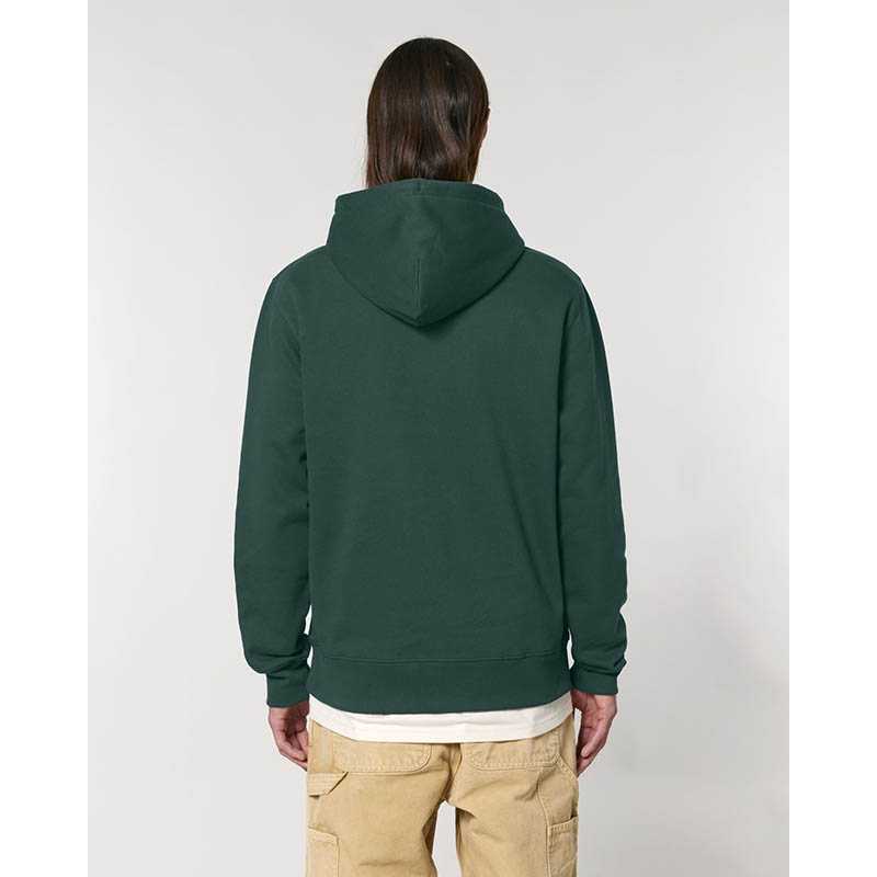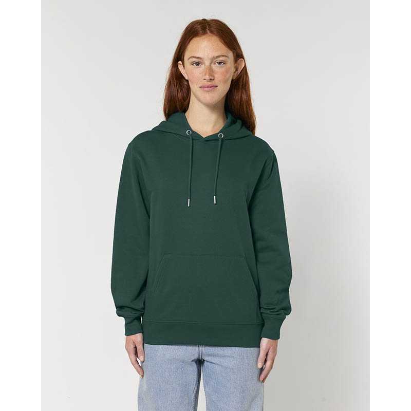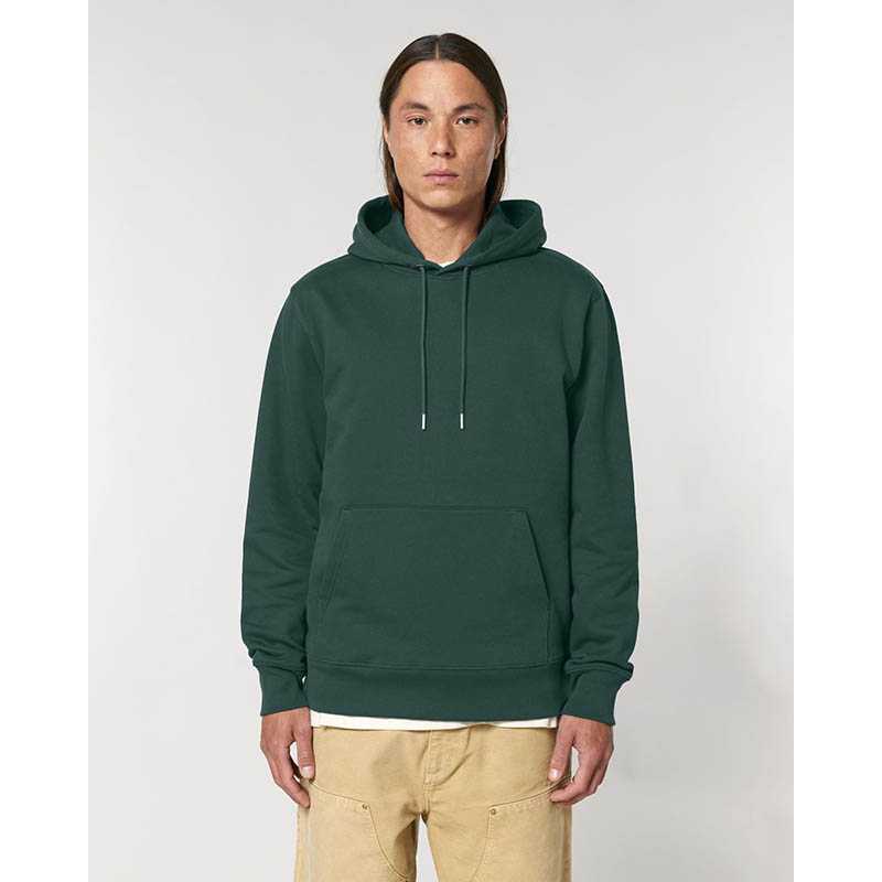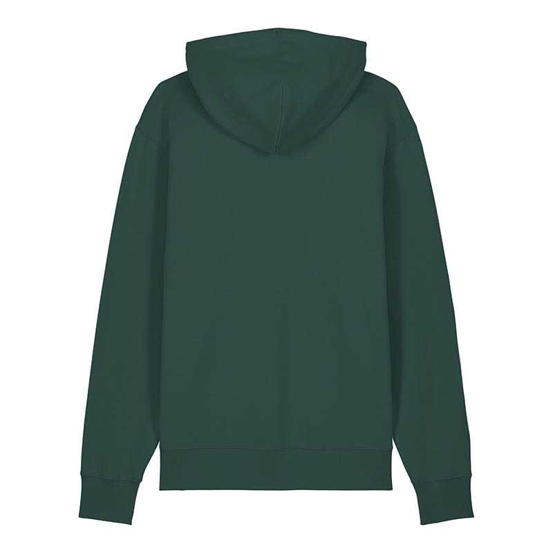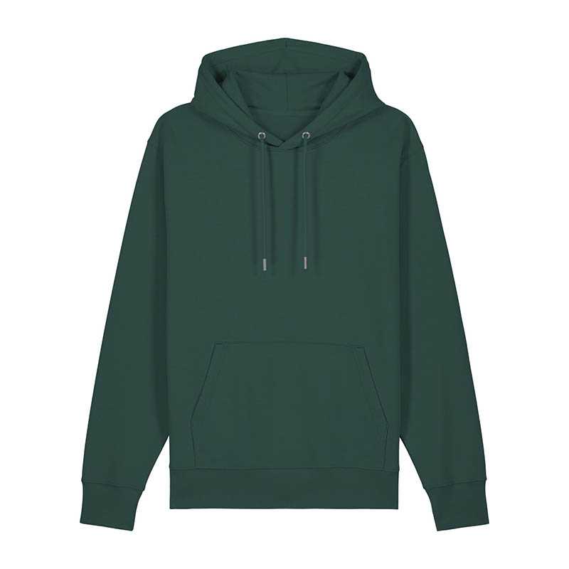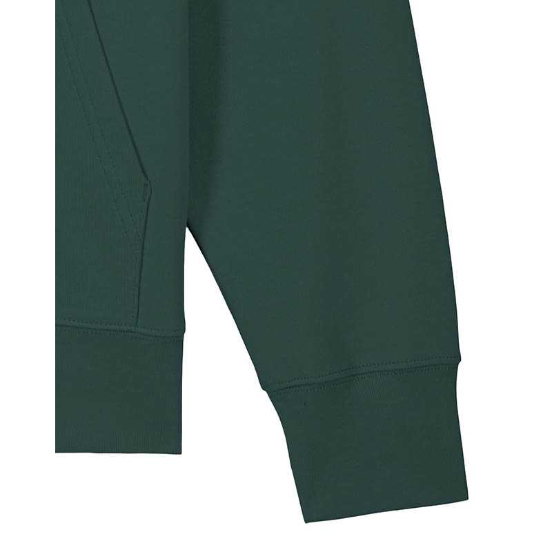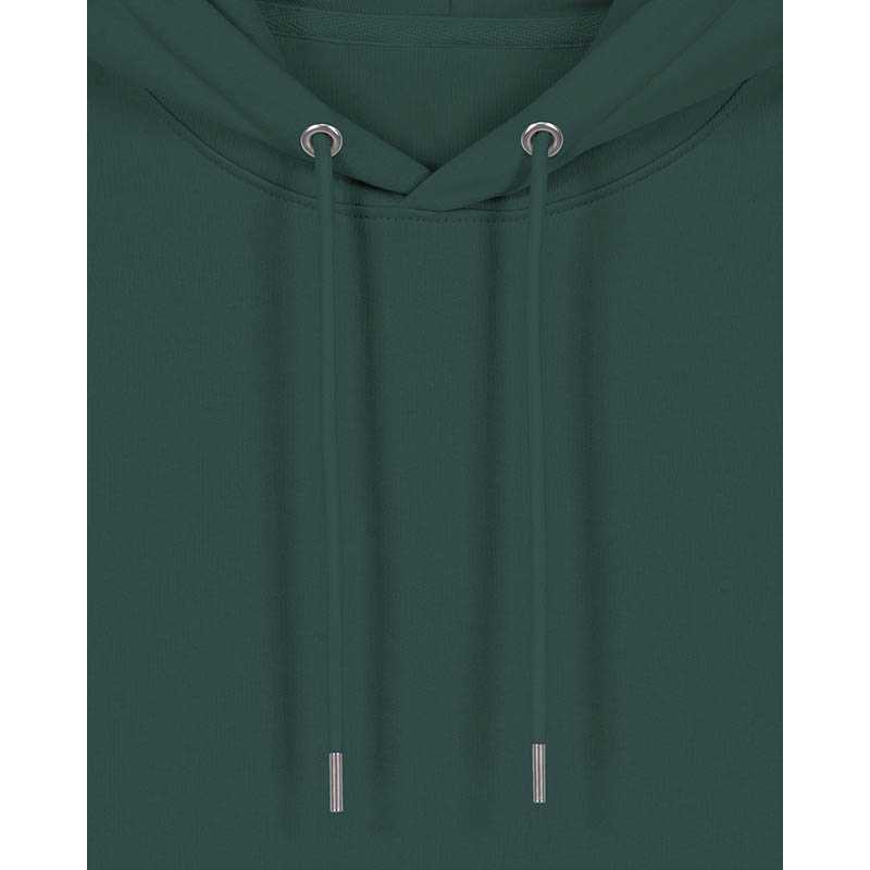Made from in-house organic cutting waste Set-in sleeve Double layered hood in self fabric Round drawcords in matching body colour with metal tipping Metal eyelets Inside herringbone back neck tape Self fabric half moon at back neck Single needle topstitch