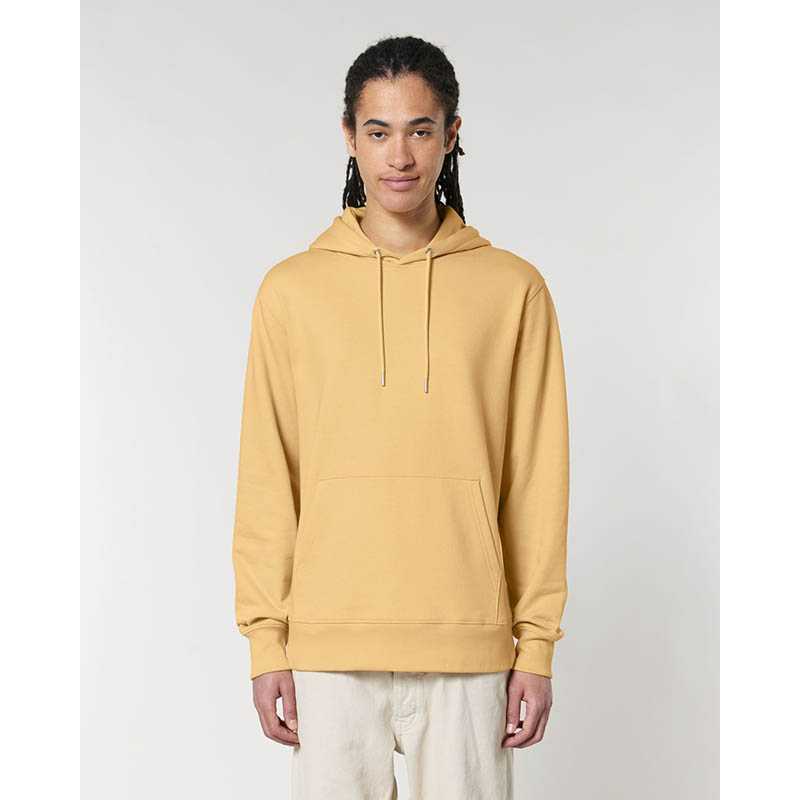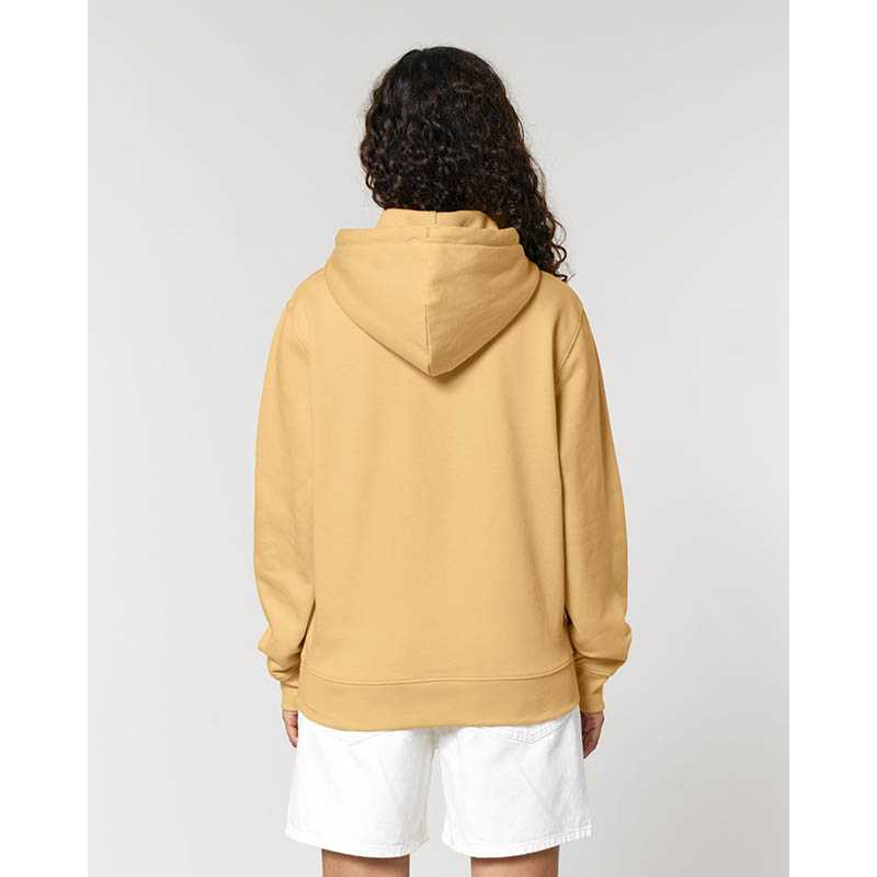 Made from in-house organic cutting waste Set-in sleeve Double layered hood in self fabric Round drawcords in matching body colour with metal tipping Metal eyelets Inside herringbone back neck tape Self fabric half moon at back neck Single needle topstitch