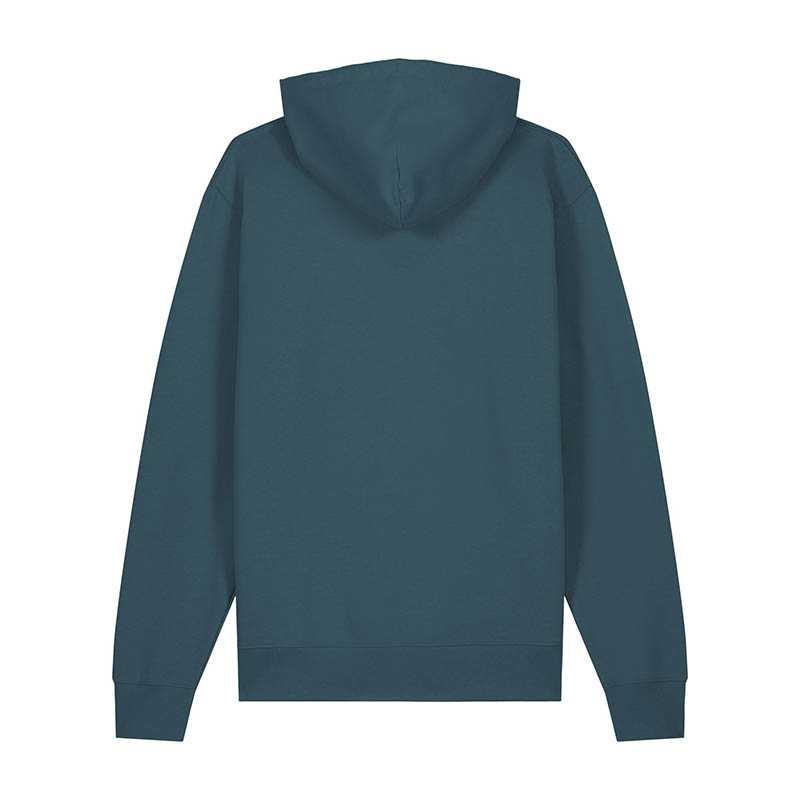 Made from in-house organic cutting waste Set-in sleeve Double layered hood in self fabric Round drawcords in matching body colour with metal tipping Metal eyelets Inside herringbone back neck tape Self fabric half moon at back neck Single needle topstitch