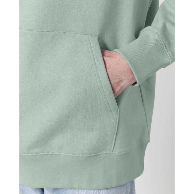 NOVINKA 2025. Set-in sleeve Double layered hood in self fabric Flat drawcords in matching body colour Embroidered eyelets Double needle topstitch on all seams 2x1 ribs at sleeves cuffs and bottom hem Kangaroo pocket at front Inside herringbone back neck