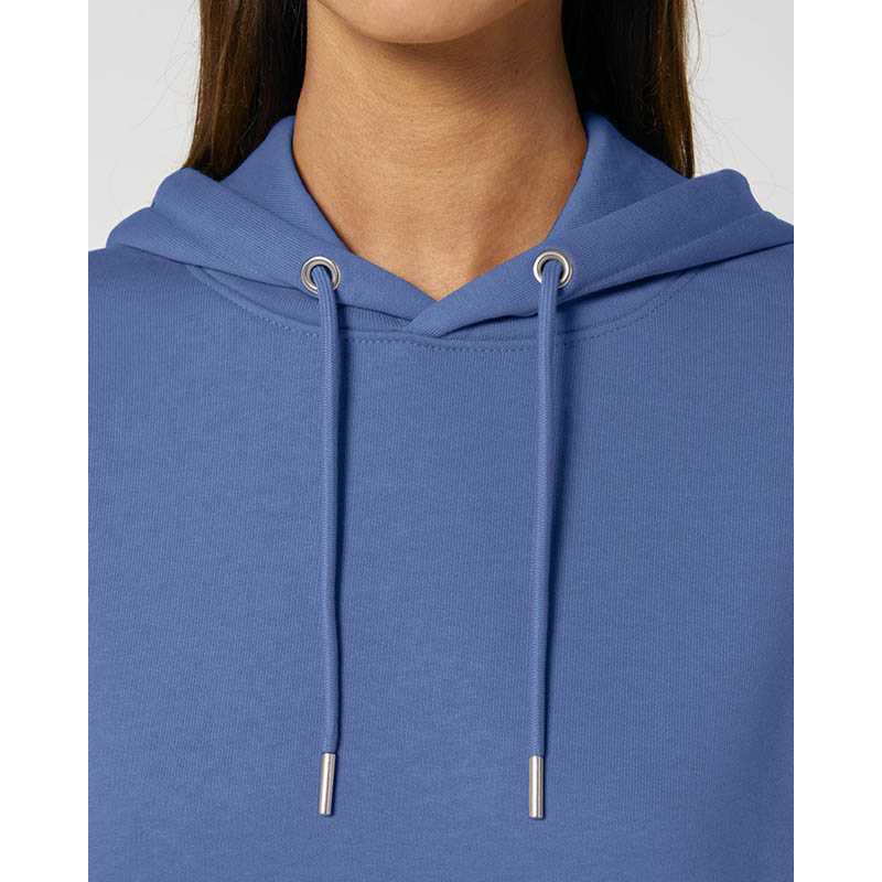 Made from in-house organic cutting waste Set-in sleeve Double layered hood in self fabric Round drawcords in matching body colour with metal tipping Metal eyelets Inside herringbone back neck tape Self fabric half moon at back neck Single needle topstitch