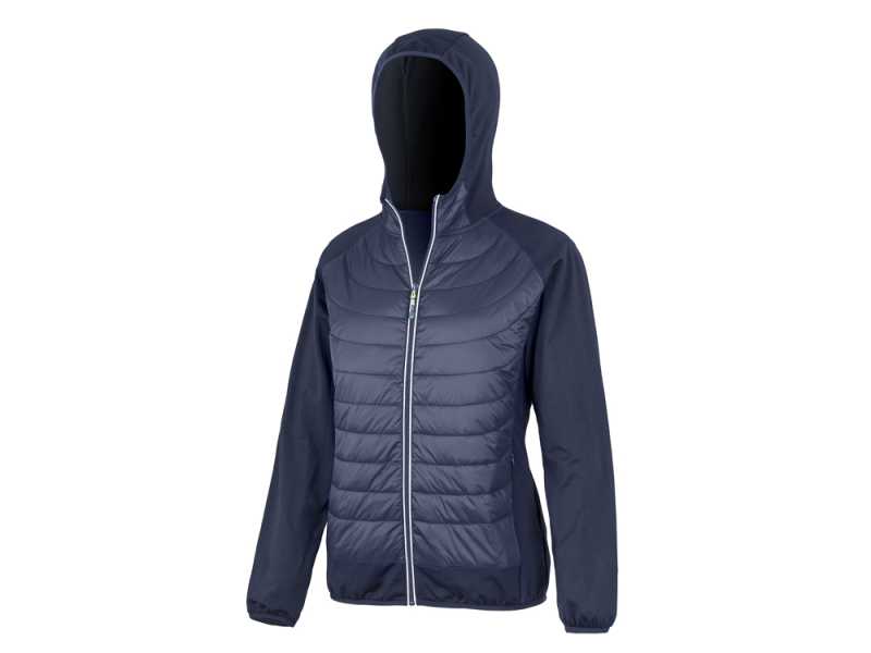 kombinácia prešívaného a softshellového materiálu, strih tvarovaný bočnými dielmi, stojáčikový gollier na gombík, celozapínací špirálový zips, bočné vrecká so špirálovým zipsom, vnútorné náprsné vrecko na zips, vstup pre branding v podšívke