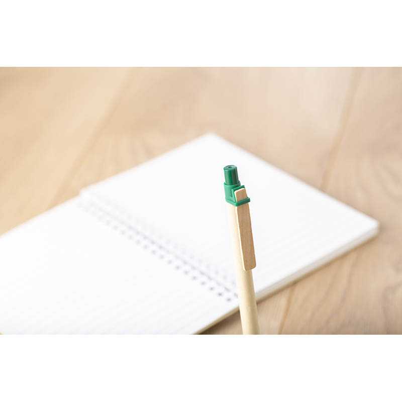 Cardboard ballpen with wooden clip and plastic parts. Blue ink.