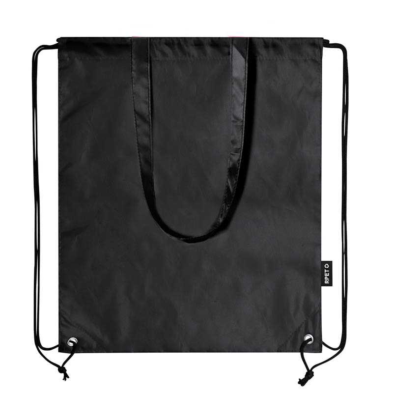 NOVINKA 2025. Drawstring backpack and bag in durable 210T RPET, with matching 70 cm carrying handles. With reinforced metal eyelets and recycled RPET side label. Available in a wide range of colours.RPET material is made from recycled plastic, thus promoting the reuse of plastic waste and helping the sustainability of the planet.