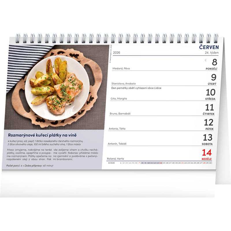 Pro všechny, kteří hledají inspiraci při vymýšlení nových jídel, je tu stolní kalendář nabitý těmi nejzajímavější recepty. Najdete zde 53 receptů, jejichž základem je poctivá domácí kuchyně, kterou vyznávaly už naše babičky. Týdenní stolní kalendář s česk