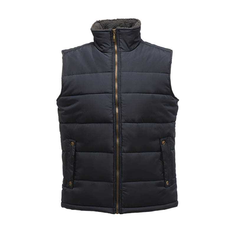 Sleeveless High collar Reverse nylon zip at center front Zipped welt pockets with extra grosgrain puller Elastic tape binding at armhole Fully quilted Side panels for better shape Inside seams with binding finish Bottom h