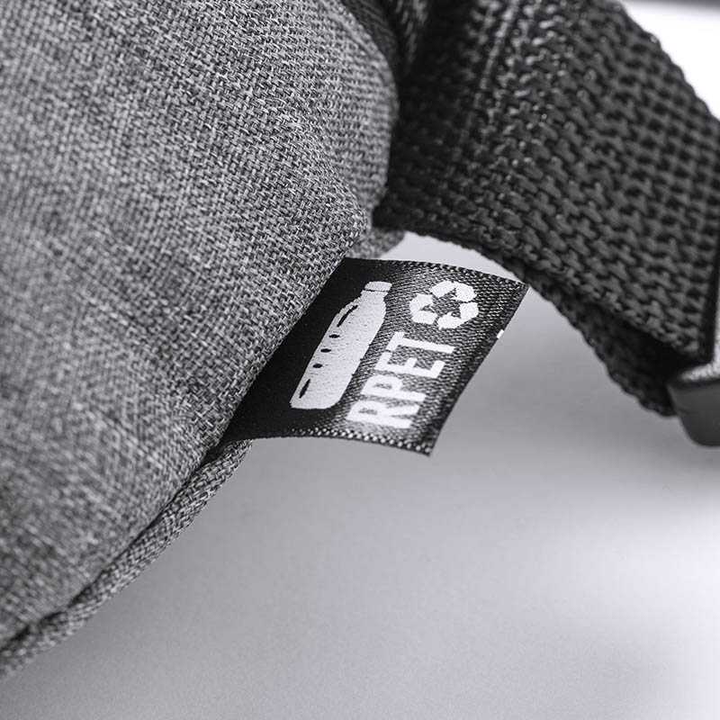NOVINKA 2025. Nature line waist bag made of resistant 600D RPET, melange effect. Made from recycled plastic to encourage the reuse of plastic waste and contribute to the sustainability of the planet. Main compartment with zip and adjustable strap with buckle closure. Designed for sports and leisure activities, with RPET distinctive on the outside label.