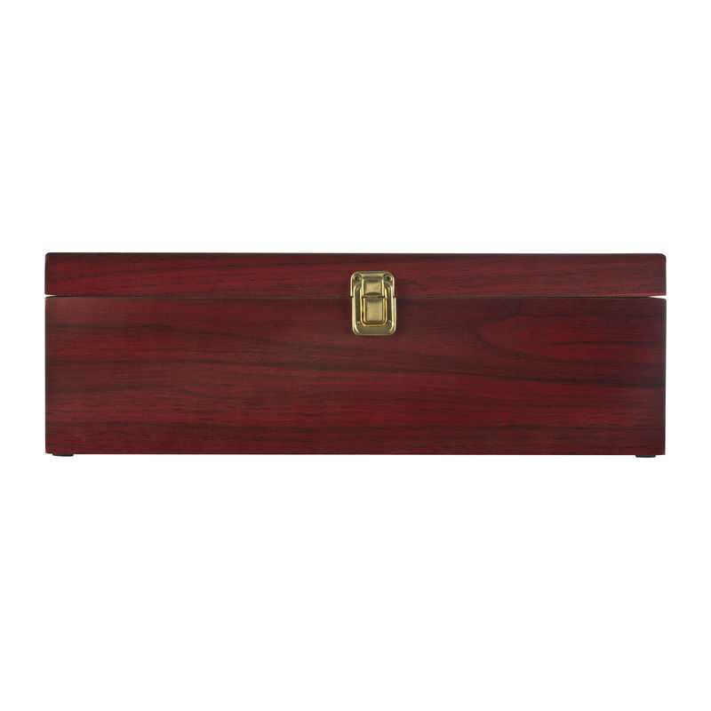 Krabička na víno z ľahkého dreva s integrovaným čašníckym nožom, zátkou na fľašu, nalievačkou a odkvapkávacím krúžkom vo veku. Víno nie je súčasťou sady.
