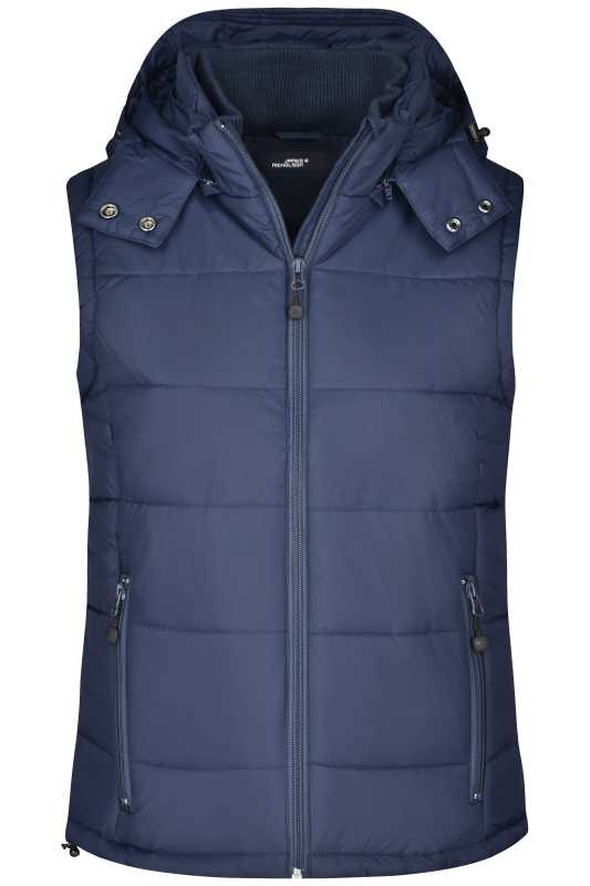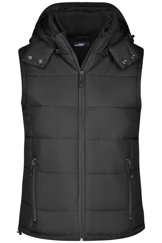 Módní dámská prošívaná vesta James & Nicholson s odnímatelnou kapucí..Vnější materiál: 100% Polyamide .Vnitřní materiál: 100% polyester .Polstrování: 100% polyester.Větru a vodě odolná (600 mm vodního sloupce) .2 přední kapsy, náprsní kapsa a vnitřní kaps