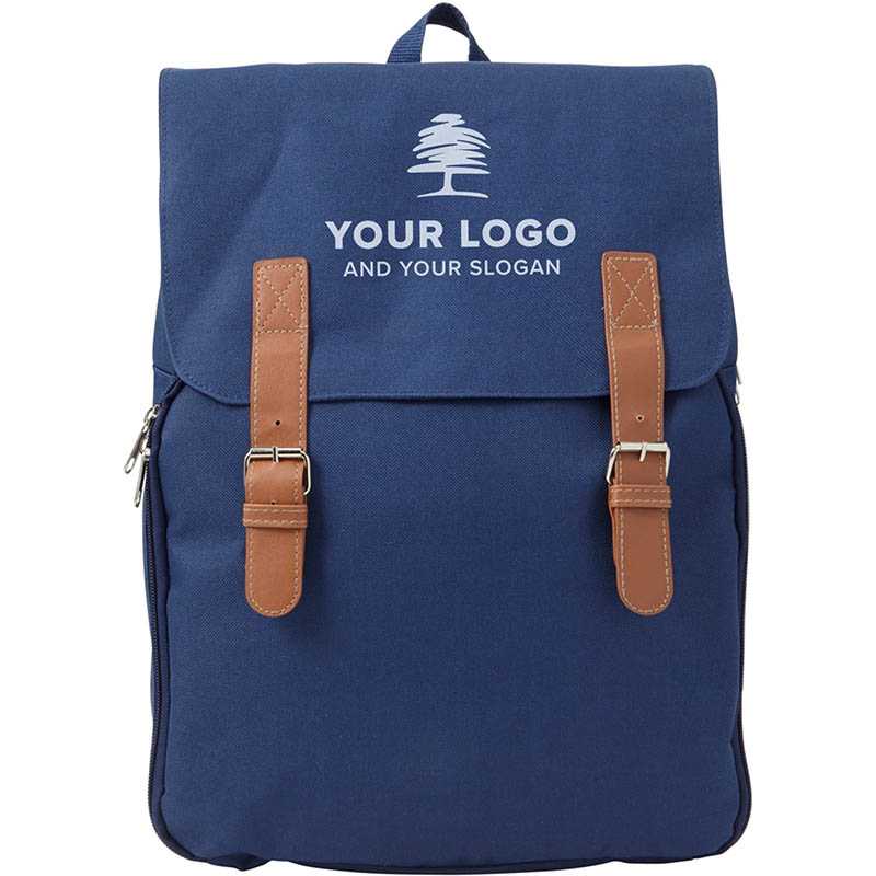 Piknikový batoh v modré barvě z polyesteru pro 4 osoby s různými doplňkami, jako například talíře, poháry, příbory a další. S extra kapsou na víno. Způsob potisku sítotisk.