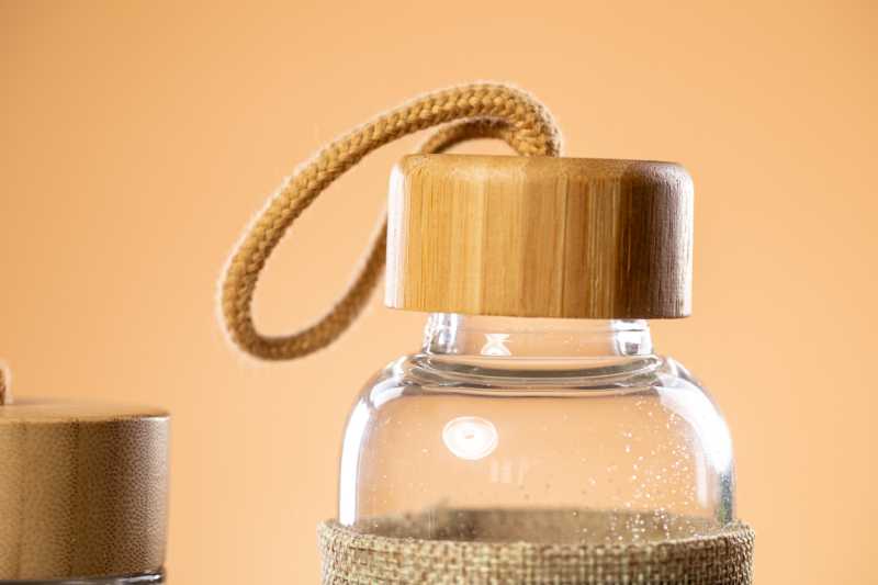 Sklenená fľaša s objemom 500 ml, korkovým návlekom pre obzvlášť príjemný pocit dotyku a bambusovým viečkom.