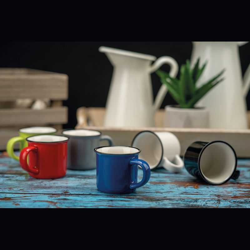 Quality ceramic mug with distinctive round handle. In all white or with coloured exterior. Capacity 200 ml. Suitable for all coffee machines. Dishwasher safe. The imprint is dishwasher tested and certified: EN 12875-2.