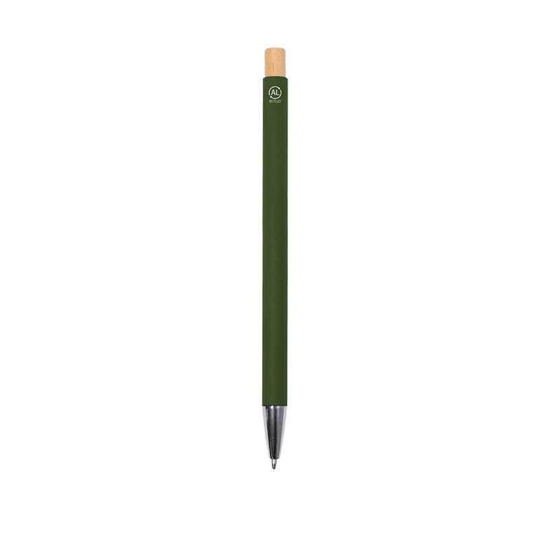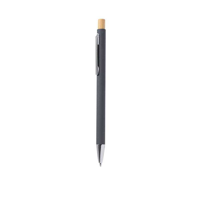 NOVINKA 2025. Push-button pen made from recycled aluminum. Bamboo button and body finished in matte rubber. Metal clip and recycled aluminum label on the top of the pen, in blue ink.Recycled aluminum is a material with almost infinite recycling possibilities, without losing its original properties and consuming less energy in this process.GRS (Global Recycled Standard) certification, which guarantees the recycled origin of the material used to manufacture the product.Materials like bamboo promote the use of natural raw materials, reducing polluting emissions. Additionally, bamboo comes from a very resilient and versatile plant, with rapid growth and regeneration, making it an excellent alternative to traditional wood use.Jumbo refill.