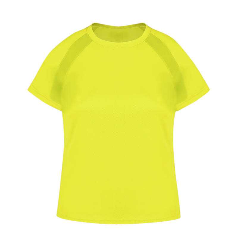 NOVINKA 2025. Woman technical T-shirt in 100% polyester breathable 135g/m2 material. With raglan sleeves, round neck and with front and side bands in breathable micro-perforated fabric. Available in sizes S, M, L, XL.