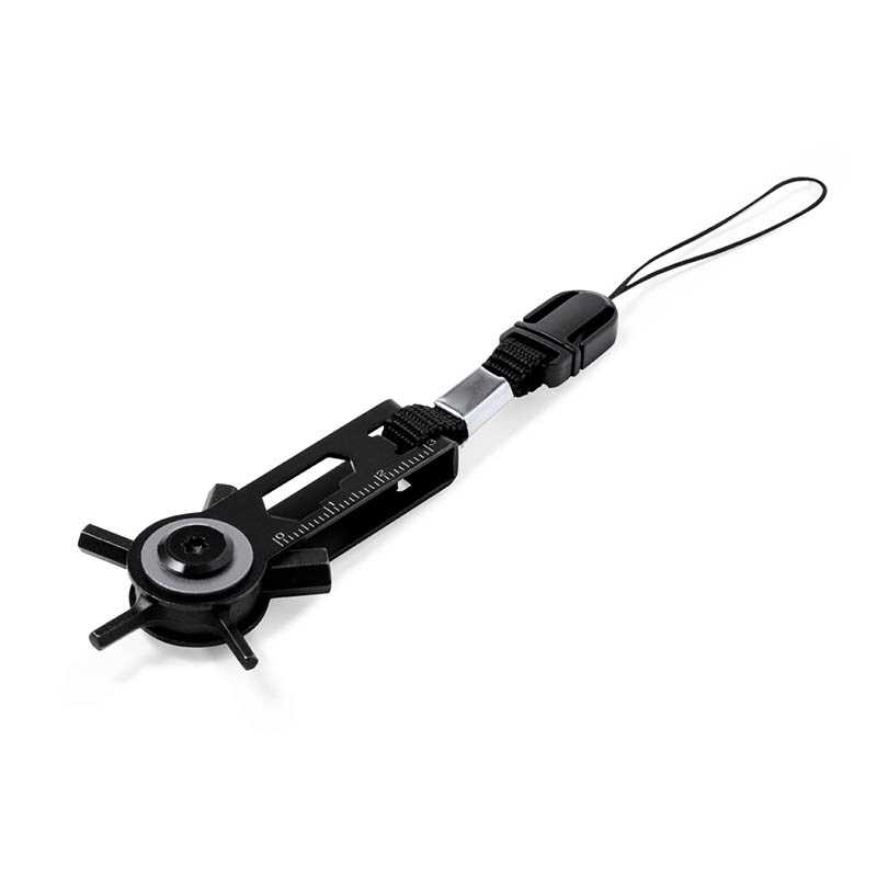 NOVINKA 2025. Genuine and handy multi-tool made in resistant stainless steel in black finish, with matching ring and carrying carabiner. With 17 functions, including flat and philips tips screwdriver hexagonal allen spanners knife and bottle opener. Presented in an individual black box.