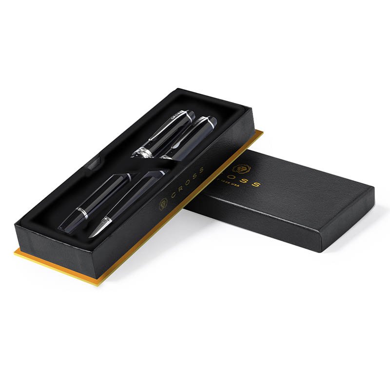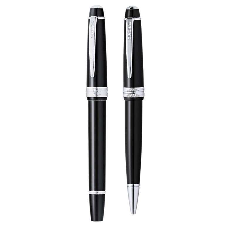 NOVINKA 2025. Set of ball pen and roller Cross Bailey Light, combining a high glossy resin with a polished chrome, metallic finish. Jumbo cartridge and black ink. Presented in an elegant, individual black case with brand logo and soft suede lining.