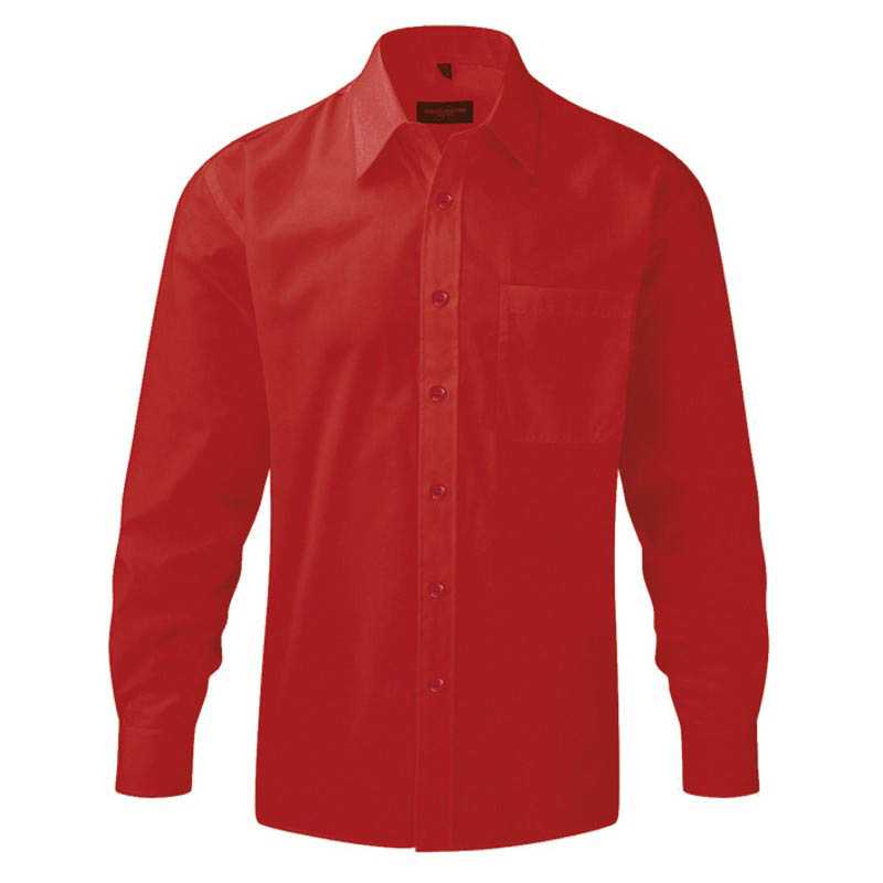 Classic style boned collar. Rounded 2 button adjustable cuff plus single button on cuff gauntlet. Back yoke with 2 side pleats. Mitred edge pocket over left chest. Straight bottom hem. Spare button. Easy Care. Značka : RUSSELL . Materiál : 65% polyester / 35% bavlna ; biela 115g/m2 , farebné 110g/m2