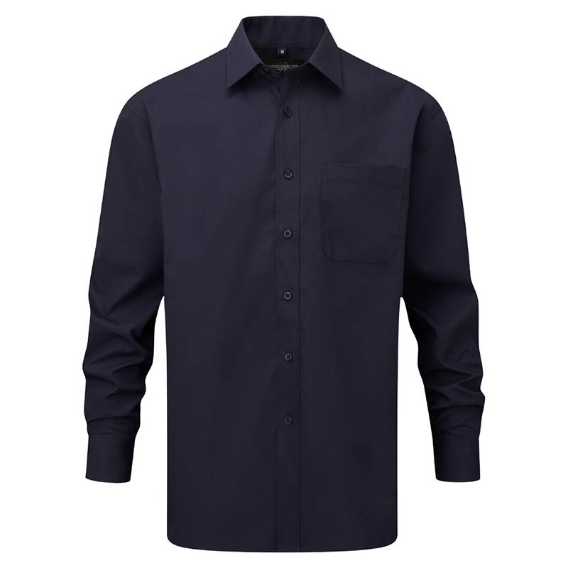 Classic style boned collar. Rounded 2 button adjustable cuff plus single button on cuff gauntlet. Back yoke with 2 side pleats. Mitred edge pocket over left chest. Straight bottom hem. Spare button. Easy Care. Značka : RUSSELL . Materiál : 65% polyester / 35% bavlna ; biela 115g/m2 , farebné 110g/m2