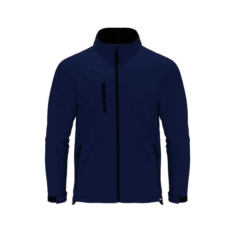 NOVINKA 2025. RPET Soft jacket made in 3 layers, 340 g/m2. With 8000mm membrane, waterproof and breathable. Exterior in Soft Shell and interior in microe polar fleece in black. With outside pocket on right chest and two side pockets with zips. With central zip and inverted zips on pockets, including black drawstring pullers. Raglan sleeves with velcro fastening system on the cuff in black. Matching chin protector and adjustable waistband, with elastic band and stopper. RPET label on the trim of the garment.