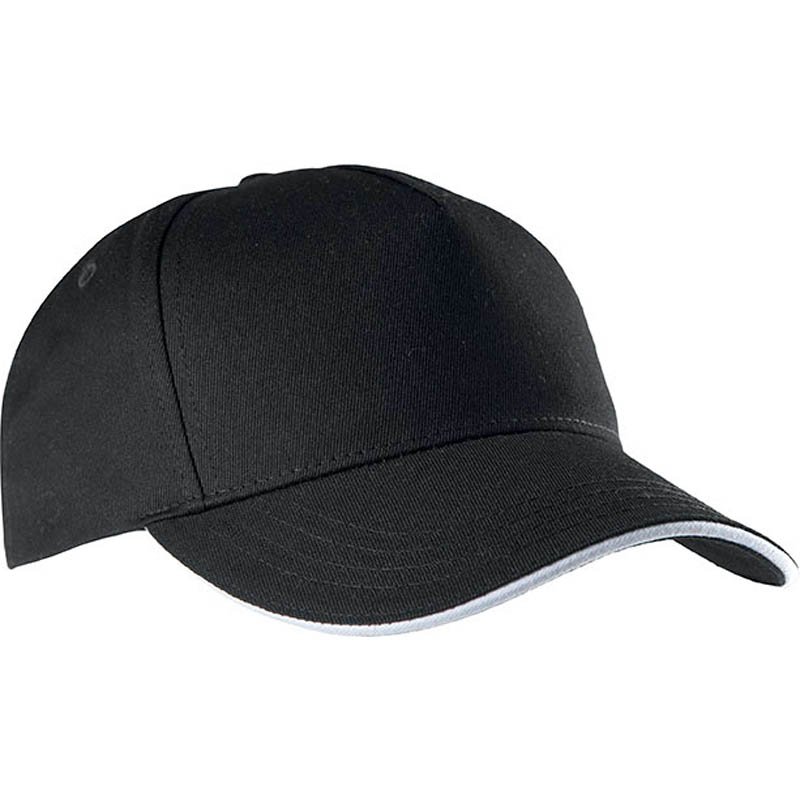 100% Cotton cap with five panels, sandwich peak, and a Velcro fastening.