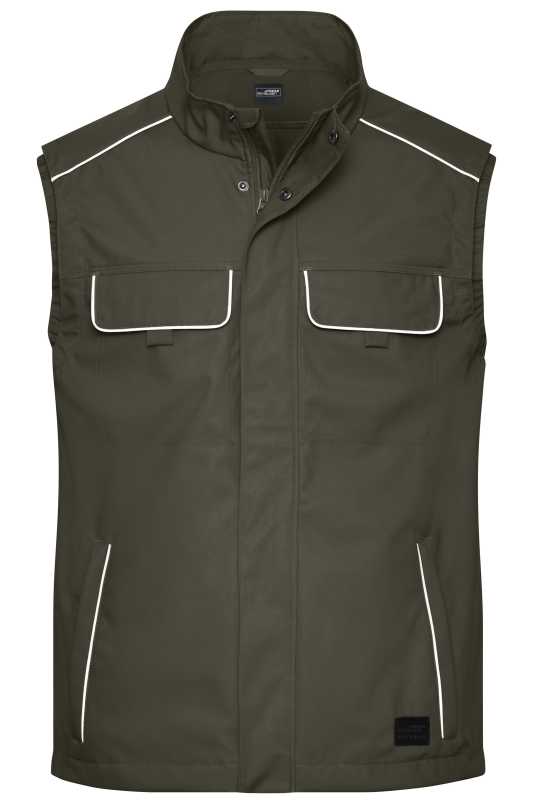 Pánská pracovní vesta James & Nicholson Workwear Vest.Profesionální vesta s vysokou kvalitou vybavení..Vnější látka: 65% polyester, 35% bavlna.Vnější materiál 2: 100% polyamid.Robustní a odolná směsová tkanina.Stojací límec s měkkým rounem uvnitř.Ramenní