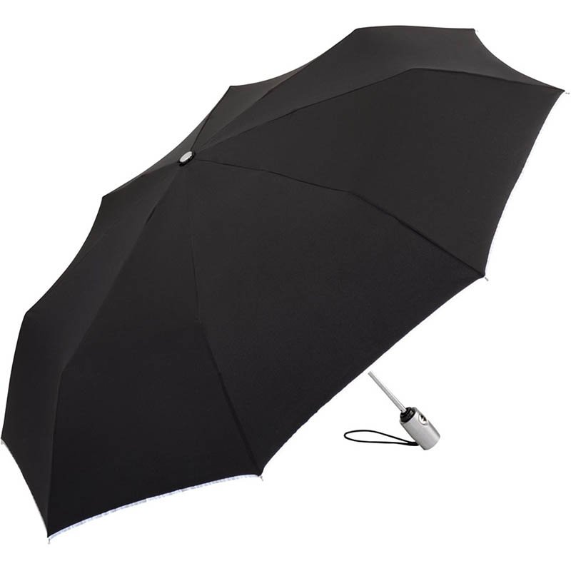 Convenient automatic open/close function for quick opening and closing, high-quality Windproof PLUS system for maximum frame flexibility in stormy conditions, flexible fibreglass ribs, chromed steel shaft, cover with trendy reflective piping in silver, aluminium finished handle with integrated push button and promotional labelling option