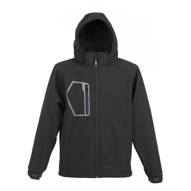 "Softshell jacket 3 layers, waterproof and breathable - “Rubber effect” fabric - 100% polyester - Waterproof 6000 mm / H2O - Breathability 4000 g/M2/24h - Mesh lining inside on front part - Raglan sleeves - Hood with coulisse - One chest pocket with zip -"