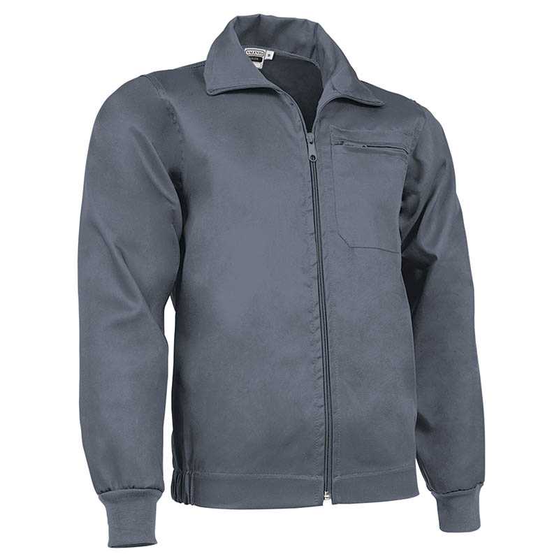 Work Jacket. Made of a sturdy cotton twill fabric blended with polyester for strength and durability. Stand-up collar with full-zip front closure for effortless functionality and practicality. A reinforced left chest zippered pocket for a secure and convenient storage, and showcase the branding. Elasticated cuffs and side waistband for a better fit and added comfort. Suitable marking methods: screen printing, embroidery, transfer printing, badges. Ideal as workwear and uniforms.