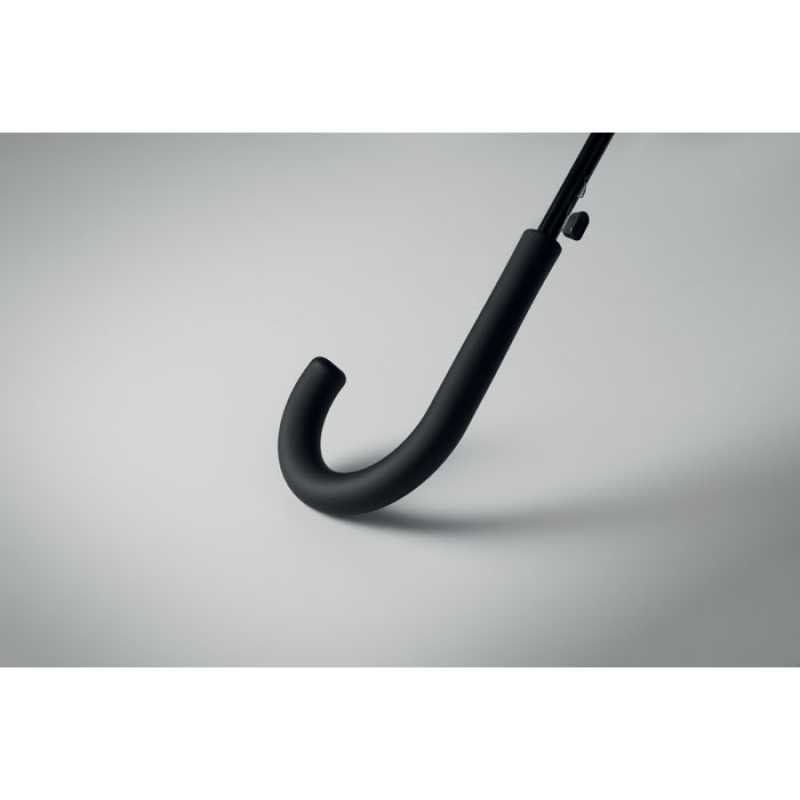 Větruodolný 23palcový deštník s automatickým otvíráním. Rám ze skelných vláken a panely z tkaniny 190T pongee. Plastové špičky a vršek. Pogumovaná ohnutá rukojeť z PP plastu. Manuální zavírání.