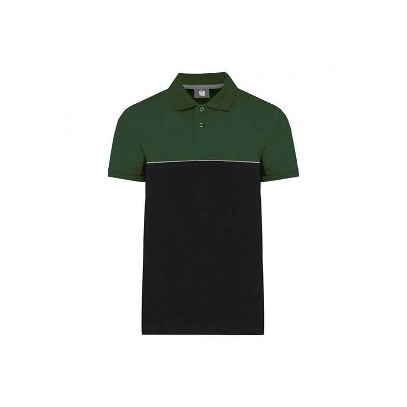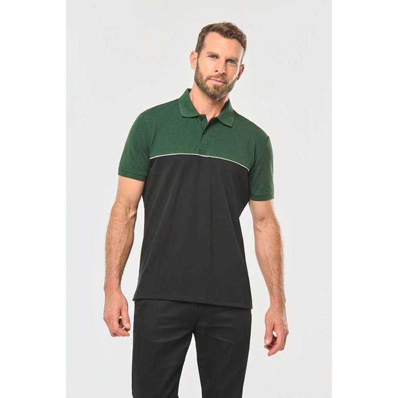 65 % polyester/35 % bavlna.(černá/šedá, lesní zelená/černá, královská modrá/námořnická modrá: 65 % recyklovaný polyester a 35 % bavlna).Úplet Piqué.Žebrovaný límec.3knoflíková sladěná léga.Kontrastní panely na pažích a po stranách.Látkové manžety.Certifikace v souladu s STANDARD 100 od OEKO-TEX® N° CQ 1007/7, IFTH.