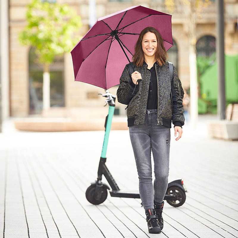 Convenient automatic open/close function for quick opening and closing, high-quality Windproof PLUS system for maximum frame flexibility in stormy conditions, comfortable Soft-Feel handle with integrated push-button, elastic loop and promotional labelling option