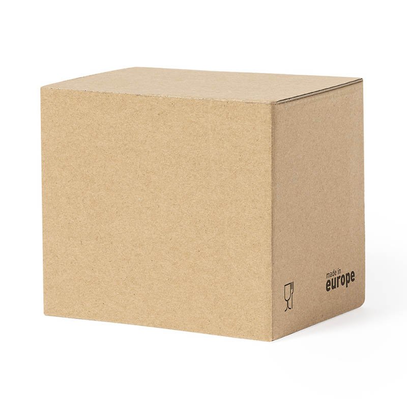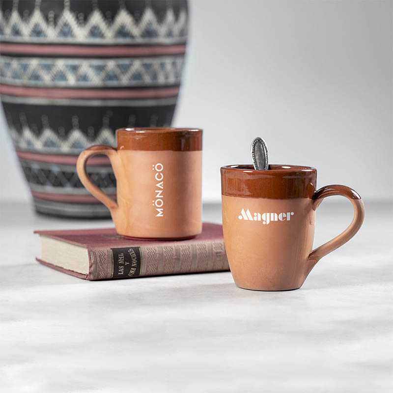 NOVINKA 2025. 330 ml classic design mug with curved design. Made in Europe using clay, which due to its natural origin as well as its craft transformation processes in the pottery industry, becomes one of the most sustainable options, as well as being highly recyclable. With a contrast of natural and lacquered finishes. Presented in an individual box with a Kraft finish and Made in Europe emblem.
