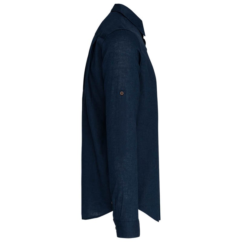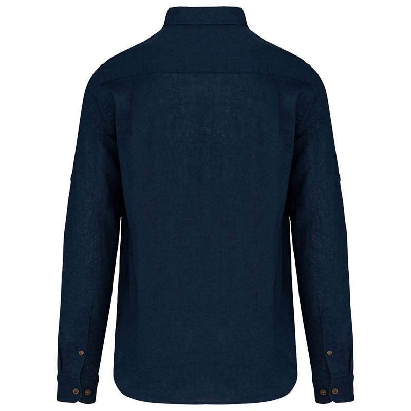 55% linen / 45% cotton. Contrasting buttons. Decorative trim underneath placket. Non-button down collar. Adjustable cuffs with button pointed tab end. Sleeves can be rolled up using a button tab. Spare button.