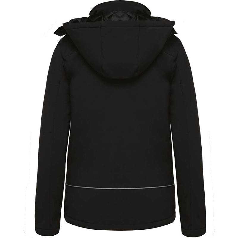 Softshell jacket 3 layers, waterproof and breathable - 97% polyester - 4% elastan - Waterproof 6000 mm/H2O - Breathability 4000 g/M2/24h - Thermic lining inside the front part - Reflective printing on front and back side - Raglan sleeves - Detachable padded-hood with drawstring - Laser cutting zip - One chest pocket with zip - Two pockets with zip - Inner wallet pocket - Elastic cuffs with velcro closing - Drawstring at the bottom