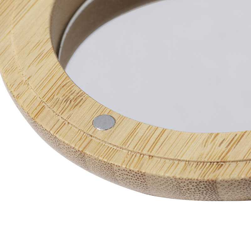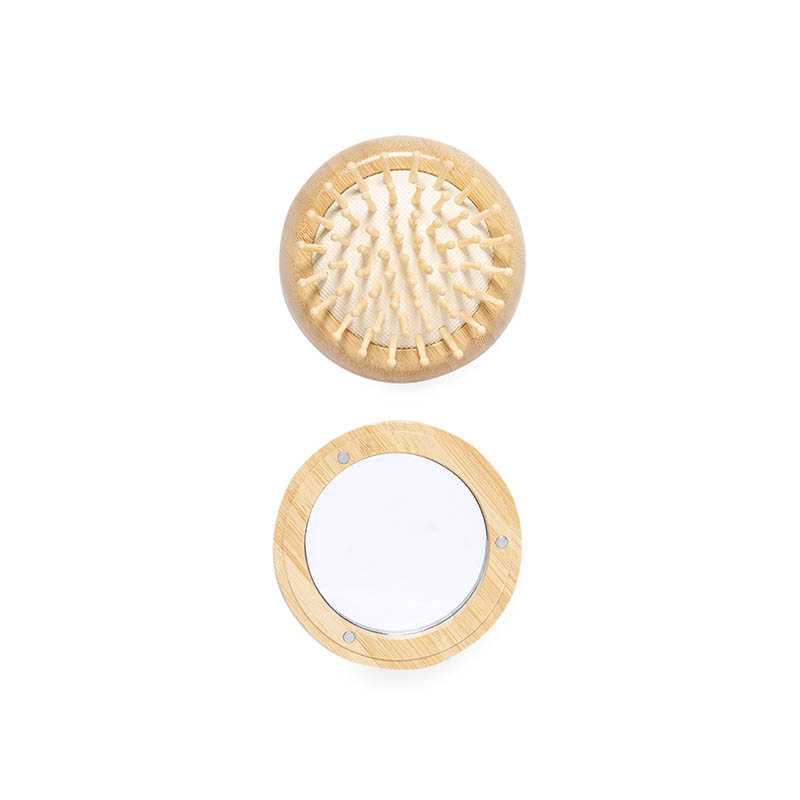 NOVINKA 2025. Unique brush with mirror made in natural bamboo. Its magnetic attachment and compact size makes it a perfect accessory for everyday use. Presented in an individual kraft design box. Materials such as bamboo promote the use of natural raw materials and reduce pollutant emissions. In addition, bamboo comes from a highly resistant and versatile plant, with fast growth and regeneration, being an excellent alternative to the use of traditional wood.
