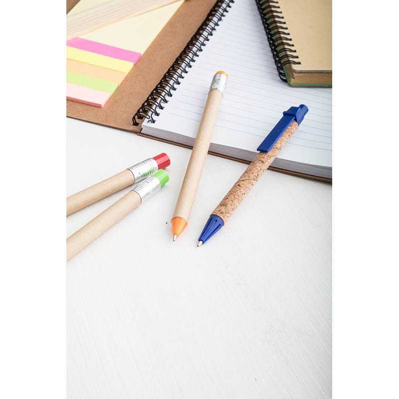 Kuličkové pero z recyklovaného papíru s korkovým povrchem a plastovými částmi, s modrou náplní.