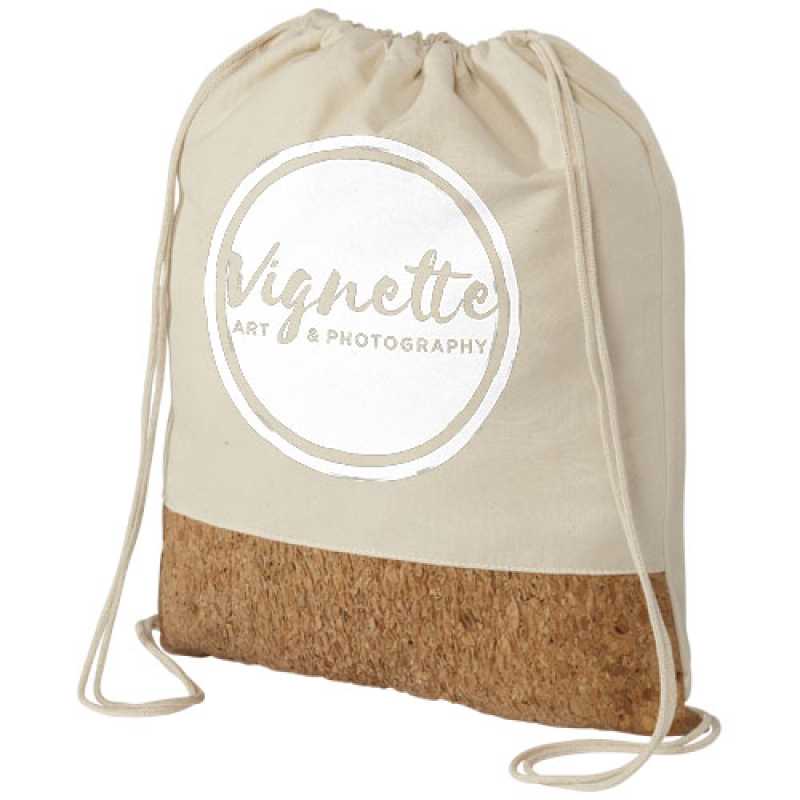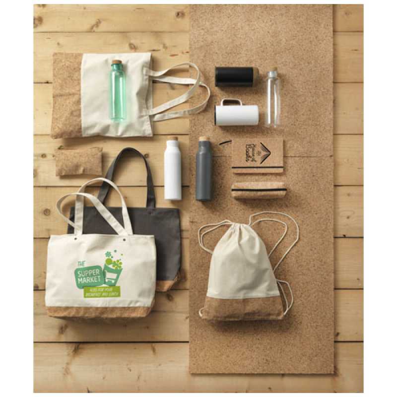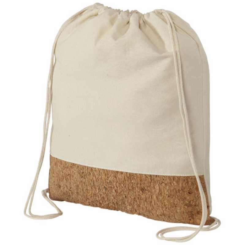 Batoh s otevřeným hlavním oddílem a bavlněným zavíráním na šňůrku. 100% korkový panel na předním dně.