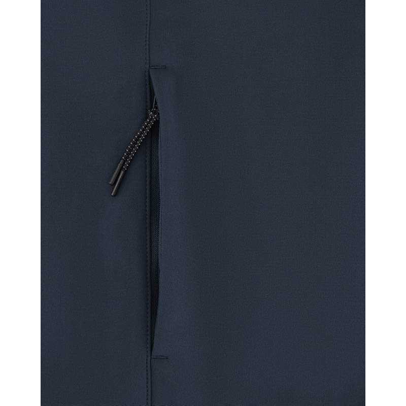 Set-in sleeve High collar and panelled hood Hood opening and bottom hem with adjustable plastic stopper and elastic cord Reverse nylon zip at center front Zipped welt pockets with reflective elastic puller Fully bonded 3 layer fabric with recycled TPU